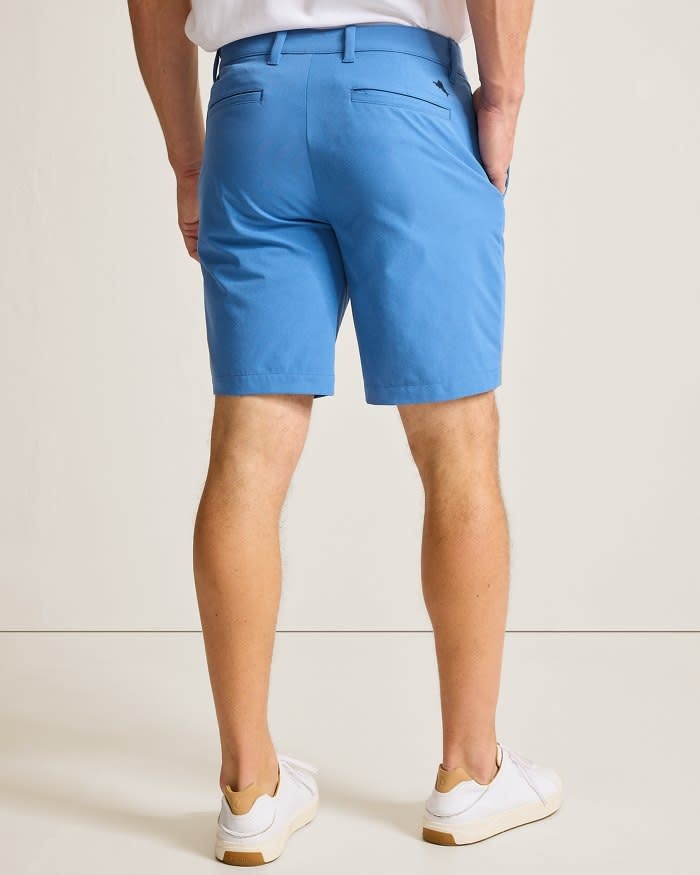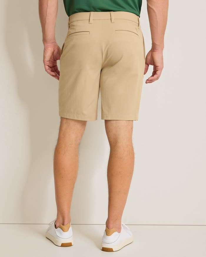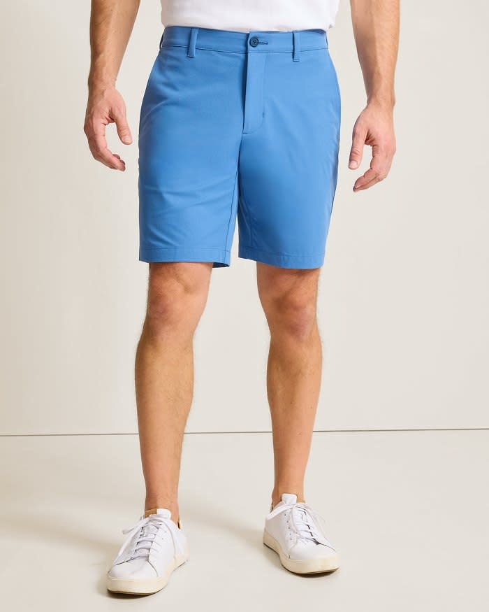 - Flat-front shorts with 4-way stretch.
