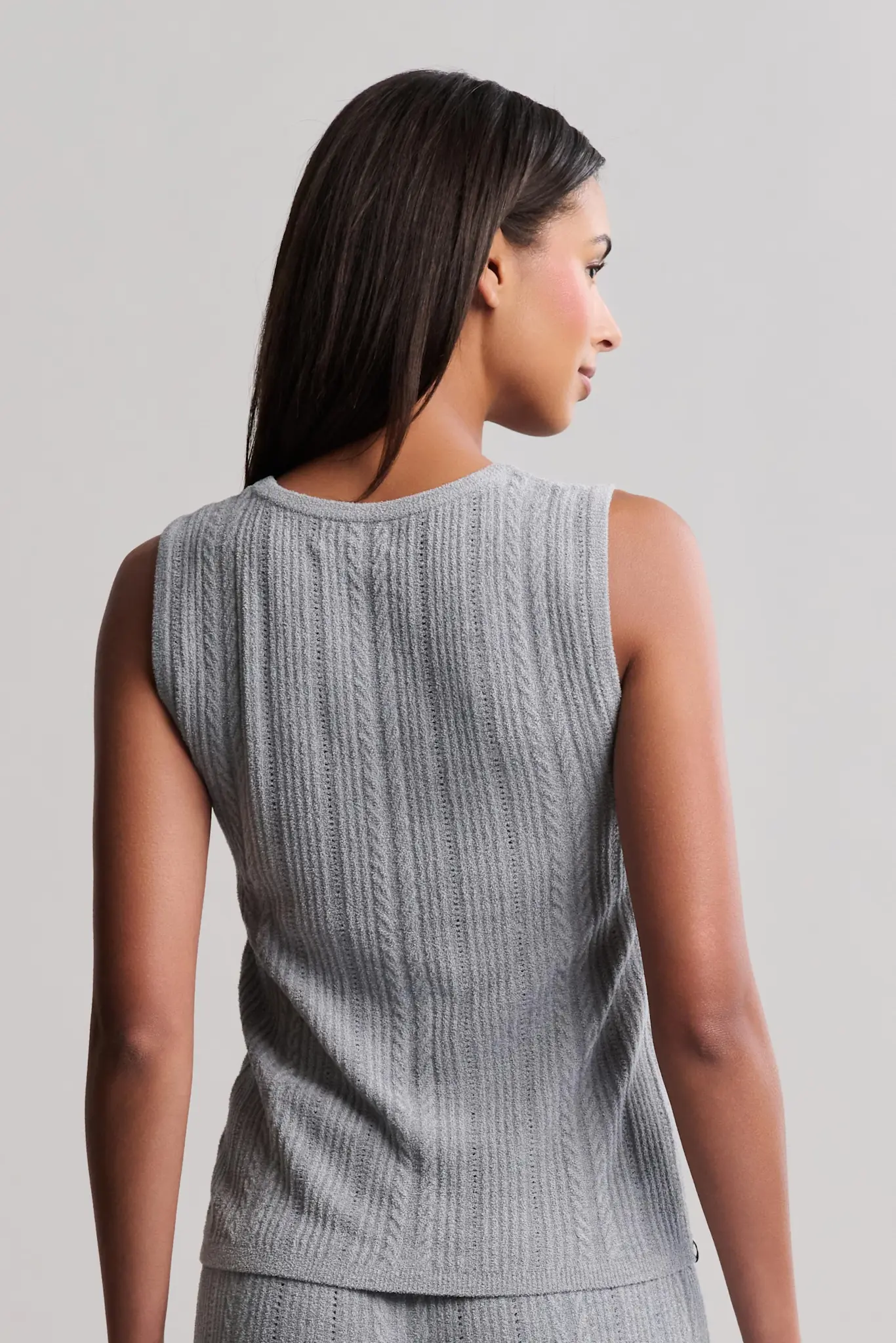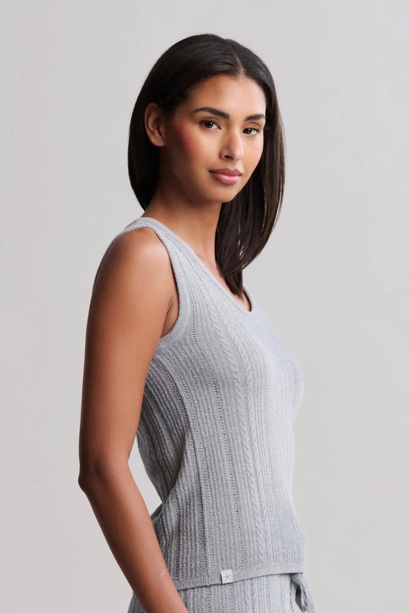 Cable rib knit with delicate pointelle stitch detailing for a feminine, breathable texture. The scoop neckline and ribbed finish along the neckline, armholes, and bottom opening offer a polished look, while the tank’s hip-length fit makes it a versatile layering piece or stand-alone top. Pairs perfectly with our CozyChic Ultra Lite® Cable Knit Cardigan with Ruffle and our CozyChic Ultra Lite® Cable Knit Ankle Pant. Imported.