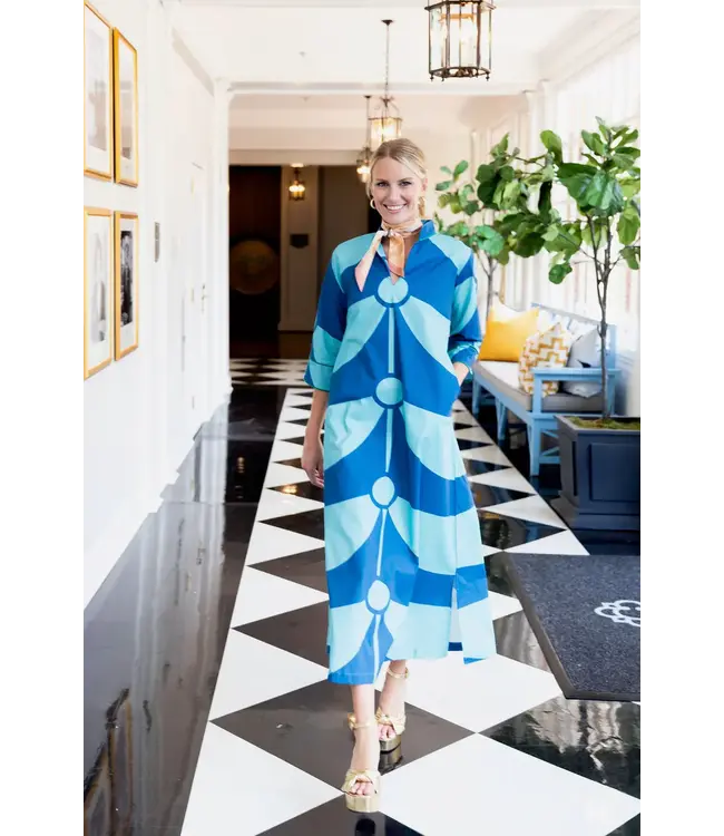 Rendered in the Blue Toddy print, this dress features layered shades of blue in a bold yet timeless graphic pattern that feels both playful and polished. The vertical placement of the print creates a flattering, lengthening effect.