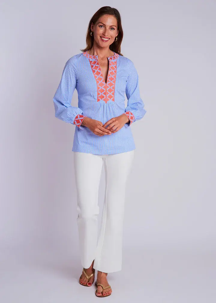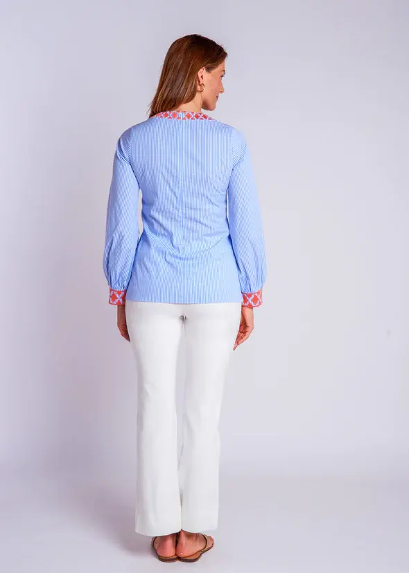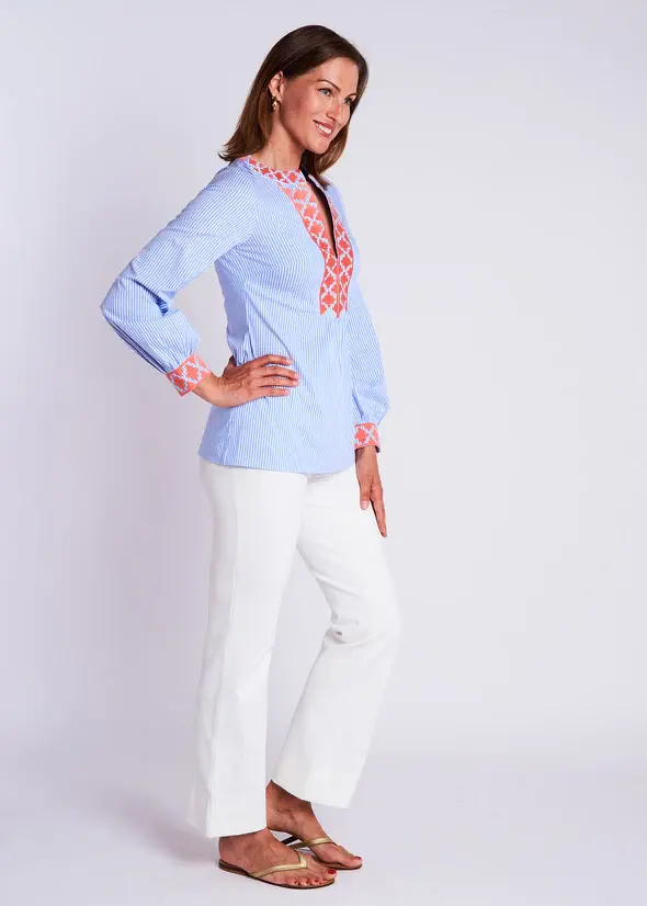 CK BRADLEYCLEMENTINE BLOUSE(0) $228.00 Excl. tax In stock (1) BLUE STRIPE","Size BLUE STRIPE","Size BLUE STRIPE","Size BLUE STRIPE","SizeColor: *BLUE STRIPESize: *SMLXLAdd to cartLogin for wishlistPay directFree shipping From $50.00Shipped today? You got 00 : 00 : 00DescriptionShareOur NEW Clementine Blouse features a contrasting coral embroidered trim at the neck and cuffs, a v-neckline, and is crafted in a classic blue and white stripe cotton blend that's both crisp and offers stretch. Facebook Tweet Pin it WhatsappAdd to comparison list