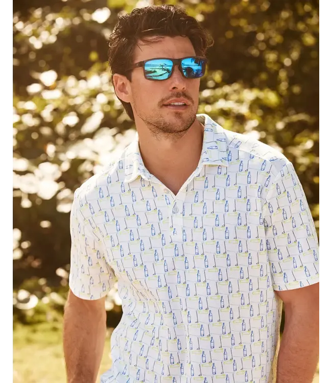Elevate your fashion style in this Tommy Bahama Men's Emfielder Caddies And Cocktail Polo Shirt in White. This Emfielder Caddies And Cocktail Polo Shirt by Tommy Bahama features printed pique short sleeve polo with wicking, quick dry,