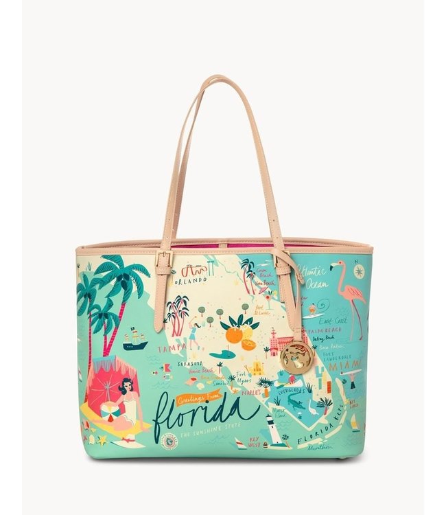 This tote with our signature golden Spartina logo features an open top design with a simple lobster claw closure. A roomy interior includes three slip pockets and one zip pocket. The cotton canvas lining is bright and fun, yet is also sturdy.