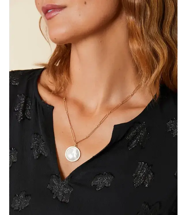 Shimmering mother-of-pearl pendant framed by a textured golden ring on a lustrous 18kt matte gold plated thin paperclip chain. Simply beautiful with any outfit. A classic you will be pulling out of your jewelry case again and again.