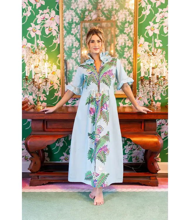The Gracie© print blends airy blues with vibrant botanical motifs for a look that feels playful and still polished. The print placement draws the eye vertically, creating an elegant, elongating effect that is as flattering as it is striking.