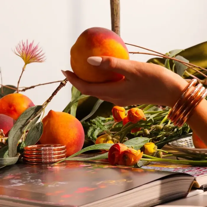 Each bangle in the KOI Pêche trio is flecked with silver foil, casting moonlit reflections that dance with every movement—a gentle reminder that ritual lives in the details.