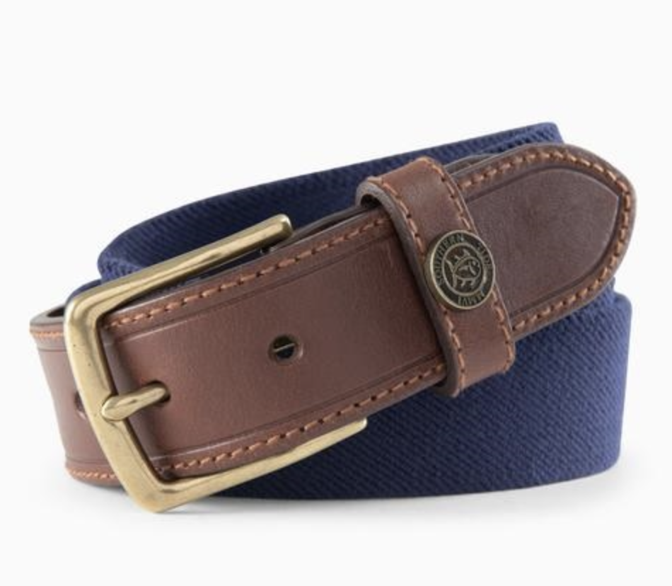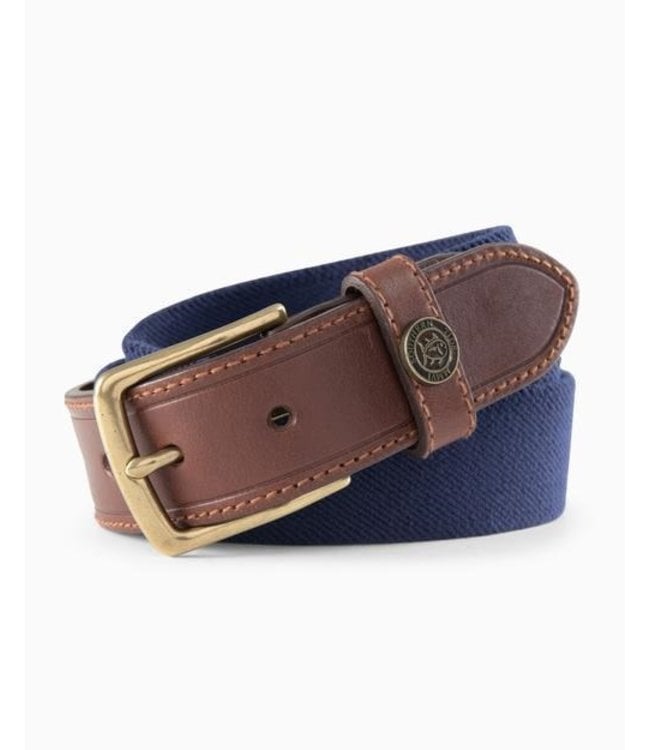 Casual days call for casual style. This sporty belt has built in stretch for a custom fit every time. Nicely appointed with a leather tab and tip, antique brass buckle and a Signature Southern Tide riveted keeper with cast Skipjack emblem.