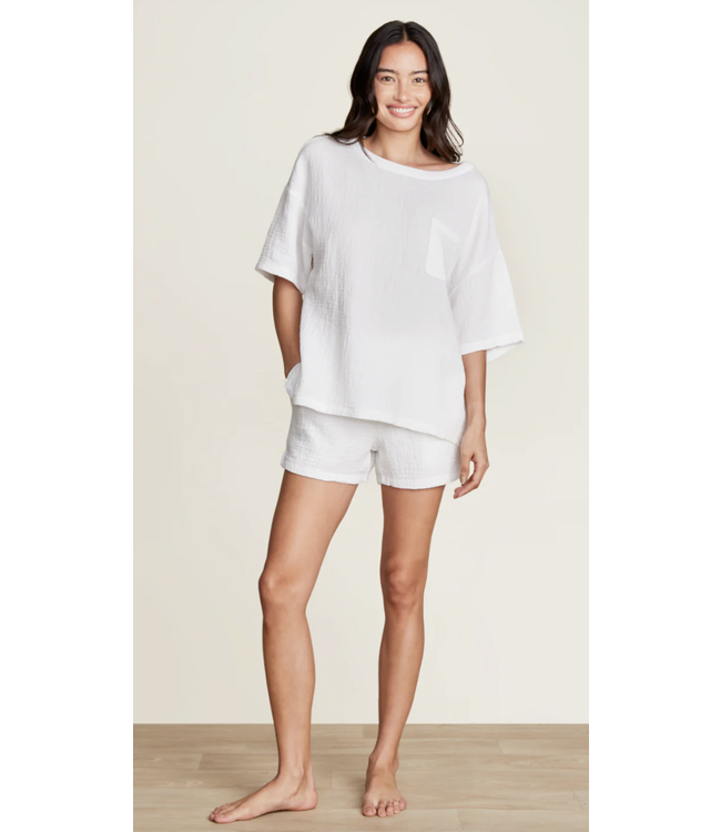 Our new Sun Soaked Crinkle Cotton fabric is the epitome of light and airy. This tee and short set is the perfect outfit to stay in or wear out, as the material is breathable, comfortable, and chic.