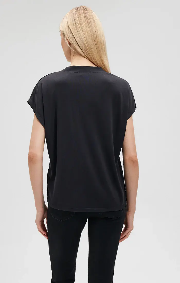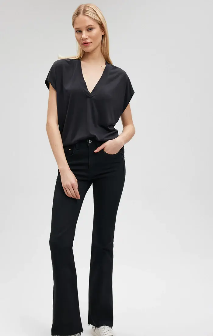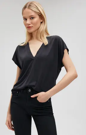 This super-soft shirt has a deep, v-neck, dropped shoulder and a fluid drape.