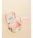 Stow & Go Jewelry Travel Case is a palm patterned box with a pink striped interior. It includes a padded earring bar with a snap closure, 2 elastic pockets, and 2 see-through zip pouches for necklaces and bracelets.