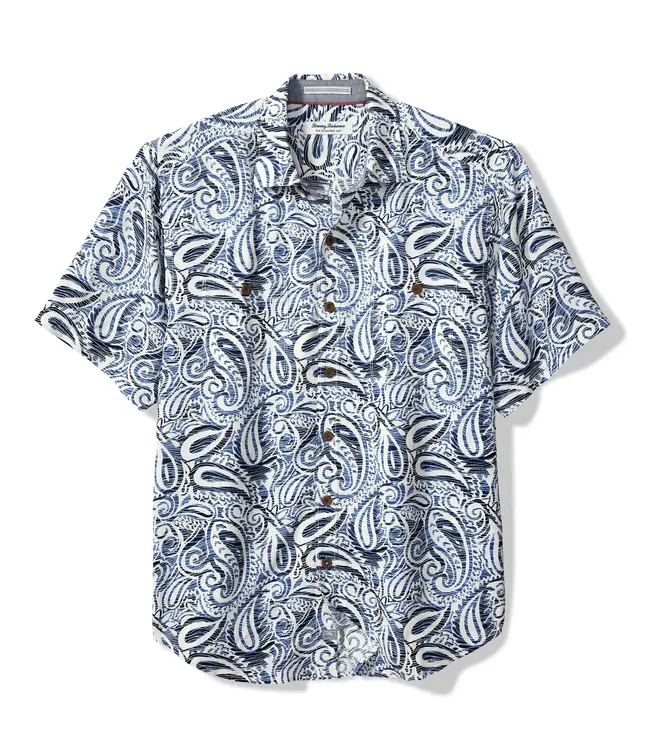 Tommy Bahama Men's Veracruz Sands Paisley Petals Camp Shirt in French Blue. This Veracruz Sands Paisley Petals Camp Shirt by Tommy Bahama features short sleeve craig collar with double button-through patch pockets & shirttail hem.