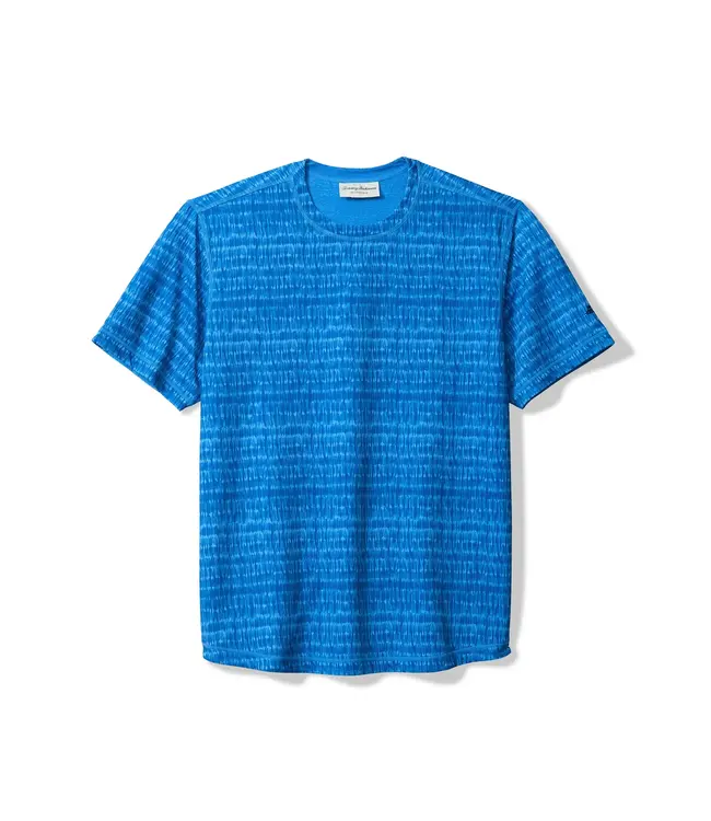 Tommy Bahama Men's Wave Break Flip Crew T-Shirt in Bering Blue. This Wave Break Flip Crew T-Shirt by Tommy Bahama features reversible short sleeve crew with two different prints per side wicking, quick dry, & UPF 30